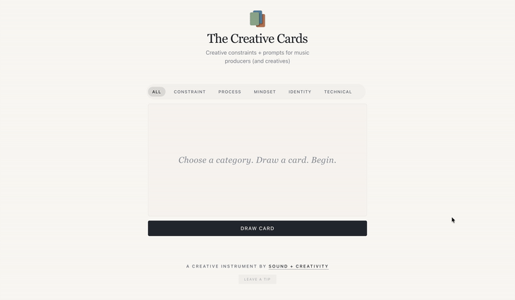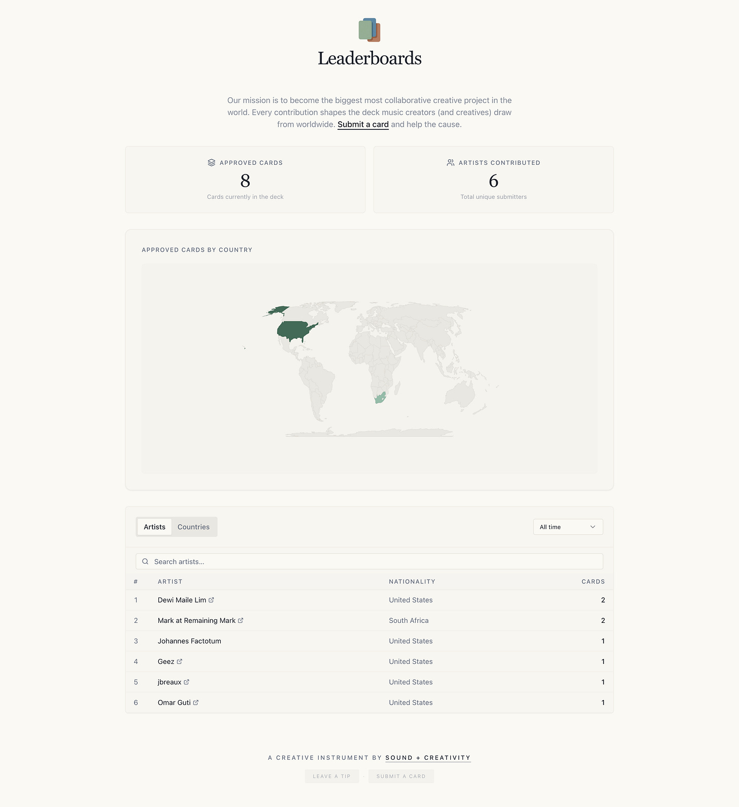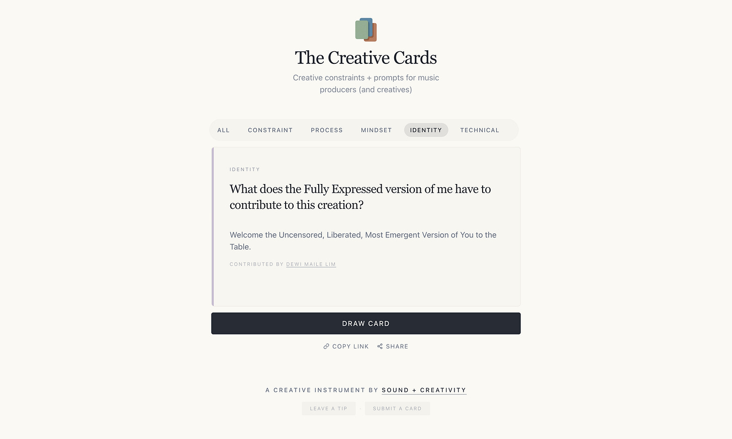 Every card submitted becomes part of the global deck that music creators draw from when they’re stuck, drifting, or doubting.