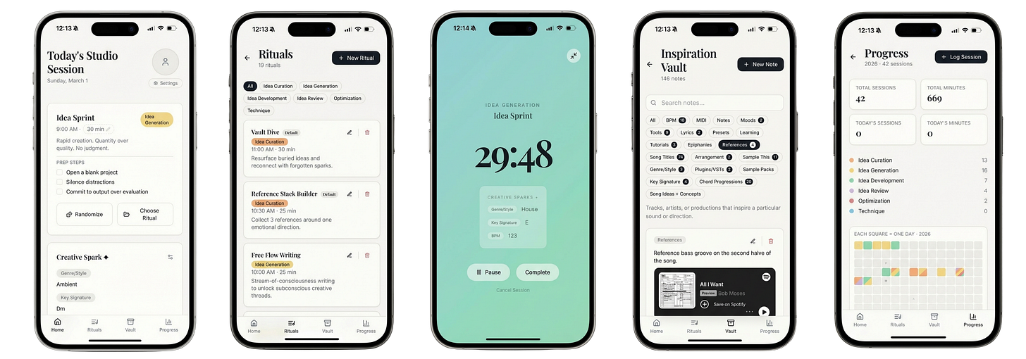 Song Ritual is the music creator’s operating system. It’s a song idea note taking app and creative session timer built directly on the five stages you just read.